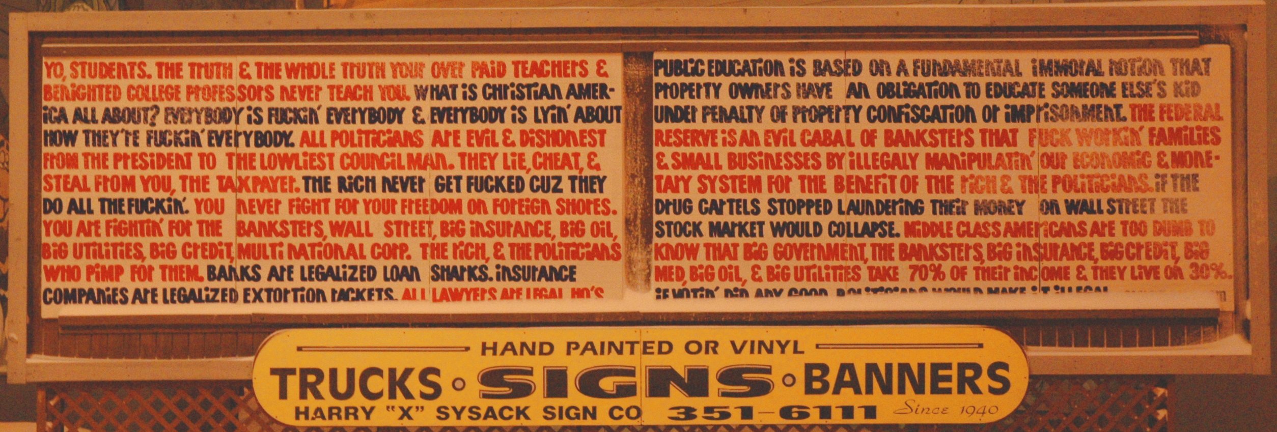 After what seemed like quite a lapse in postings, Northeast Ohio's original b'logger (billboard logger), Harry "X" Sysack, recently put on-line what he promises is "the truth & the whole truth your overpaid teachers & benighted college professors never teach you". Sysack's line is on the RTA, on his private property where W.25th forms Pearl, and his "truths" begin with "Yo, students" and include "What is Christian America all about? Everybody is fuckin' everybody & everybody is lyin' about how they're fuckin' everybody. All politicians are evil & dishonest...". And, one of my favorites, "All lawyers are legal ho's." Ho, ho, ho... feeling merry? Apparently not Harry. In fact, he appears very disturbed for the world to see. Harry is mad as hell, and feels free to express his displeasure more openly and publicly than most anyone with any type of log. That Harry does this in a uniquely graphical and striking way elevates his "blog" to public art, and Harry is surely one of the region's most important "outsider" artists. Is the Sysack mural an indicator of the mood of the region? See his whole "truth" in a larger image size here. Note, the very last line is hidden by snow, so you'll need to swing by the sign until someone can post the conclusion here.